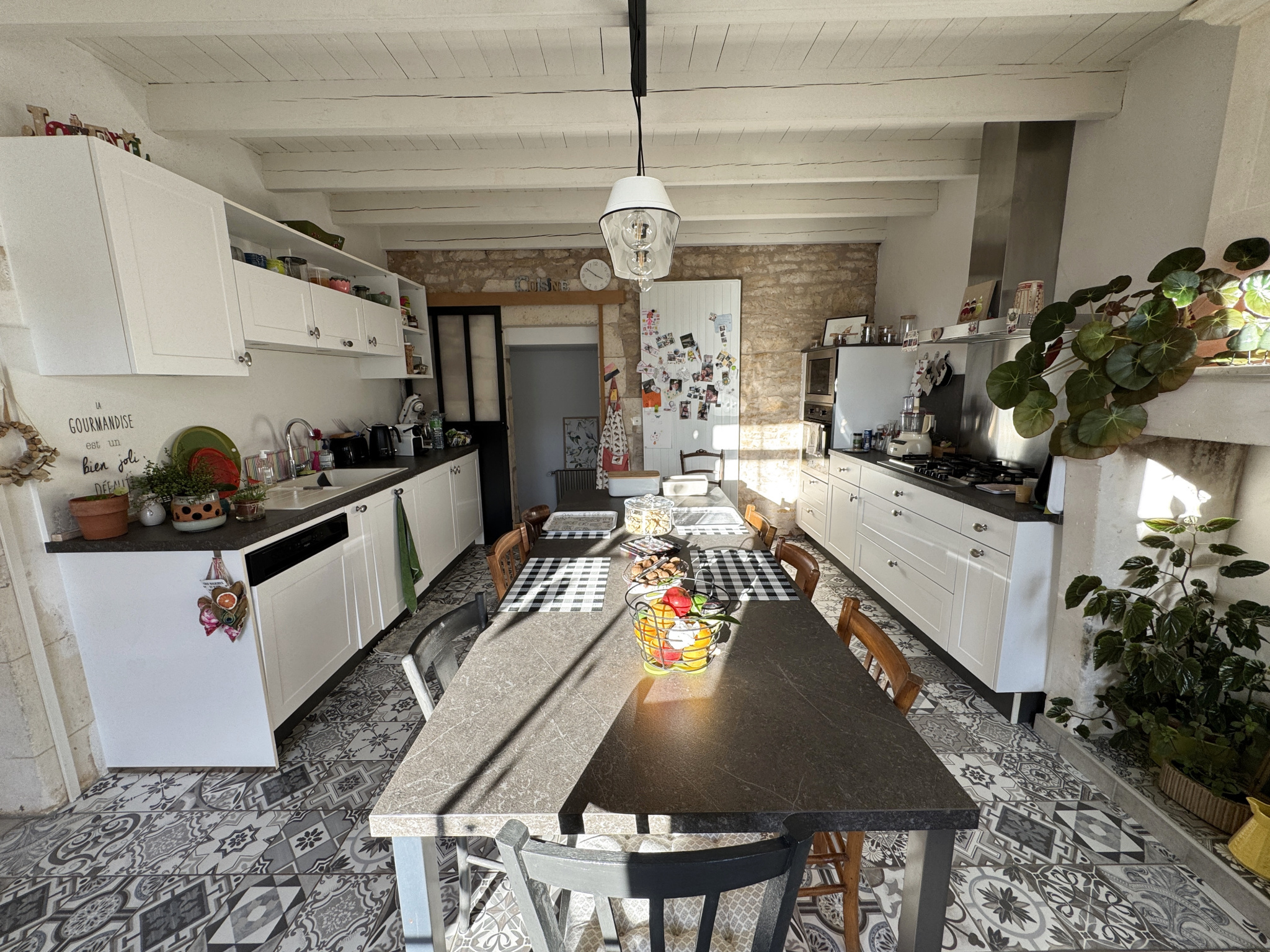 Charente-Maritime, Royan Sud, Maison 'charentaise' de charme. Hameau au calme proche village tous commerces, Plage à vingt minutes. Séjour, cuisine équipée et aménagée, quatre vastes chambres, jardin, face au soleil, grand garage camping-car. Cette maison traditionnelle en pierre a été rénovée avec des matériaux de grandes qualités, ce qui lui donne un charme certain. Nous avons bien sûr double vitrage, volets Thermo-alu, chauffage avec pompe à chaleur neuve, adoucisseur, visiophone, porte de garage (camping-car) électrique etc. Aucun travaux à prévoir (Désolé pour les bricoleurs), la cuisine et le séjour sont pourvus de cheminées dont une avec un poêle à bois récent, équipée d'électroménager de grandes qualités, celle-ci à garder un minimum d'authenticité avec du carrelage « tendance » et une grande famille peut s'y réunir pour des repas conviviaux. Les quatre chambres sont grandes (une de plus de dix-neuf mètres carrés), la salle d'eau dispose d'une douche « à italienne » et nous avons deux toilettes, buanderie, cellier. Le joli jardin plein sud se prête plus 'au farniente' qu'au jardinage. Le grand et haut garage séduira votre camping-car. Cette maison de charme au calme se trouve pourtant proche de tout : Saintes, Royan et ses plages, Saujon, les grandes voies de communication, sont à quelques minutes. À visiter sans tarder.